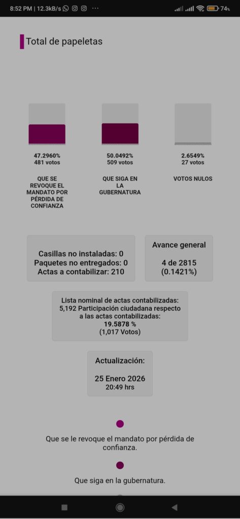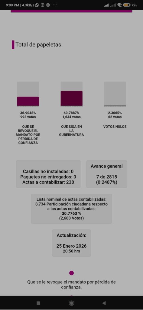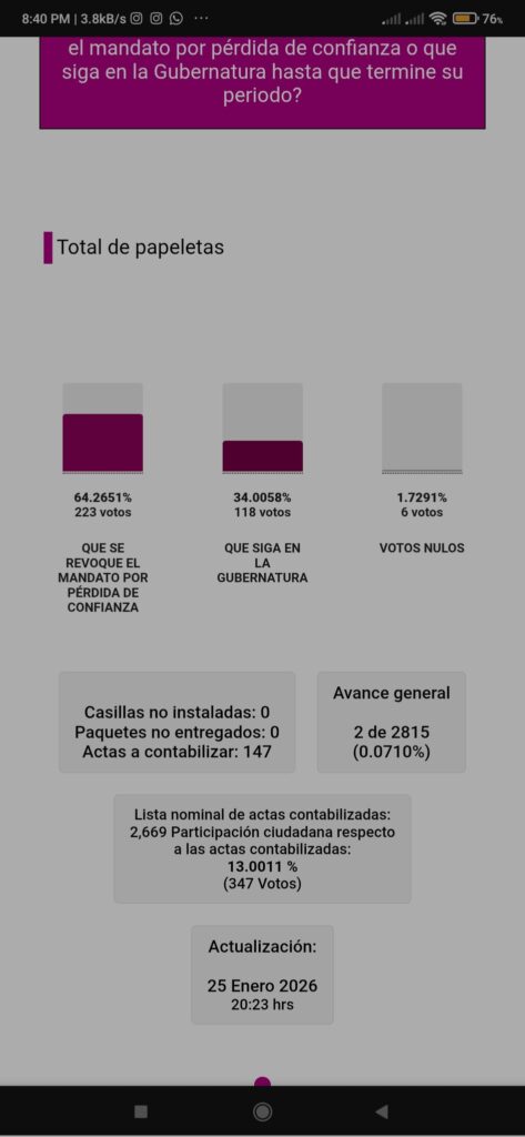 Aunque los cómputos distritales continuaban al cierre de la jornada, las autoridades electorales confirmaron que no se alcanzó el 40 % de participación de la lista nominal, requisito indispensable para que el resultado del ejercicio sea vinculante.