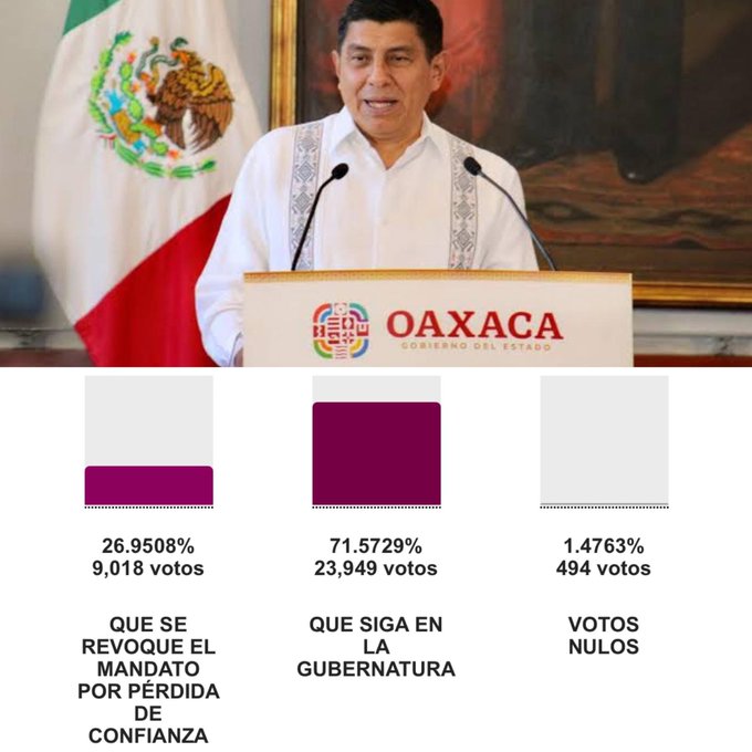 La mayoría de las y los ciudadanos que acudieron a las urnas votó en contra de la revocación del mandato, lo que implica que Salomón Jara Cruz permanecerá en el cargo como titular del Ejecutivo estatal.