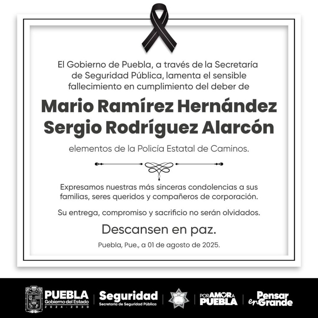 El Gobierno del Estado de Puebla a través de la SSP confirmó y lamentó el fallecimiento de dos elementos de la Policía Estatal, quienes perdieron la vida en cumplimiento de su deber este viernes, luego de un trágico accidente vehicular registrado en el libramiento elevado de la autopista México–Puebla, a la altura de San Felipe Hueyotlipan.