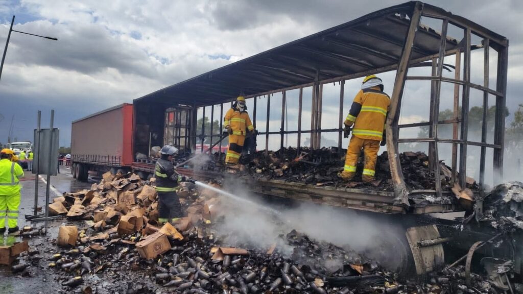 El tractocamión que transportaba cervezas se incendió tras impactar.