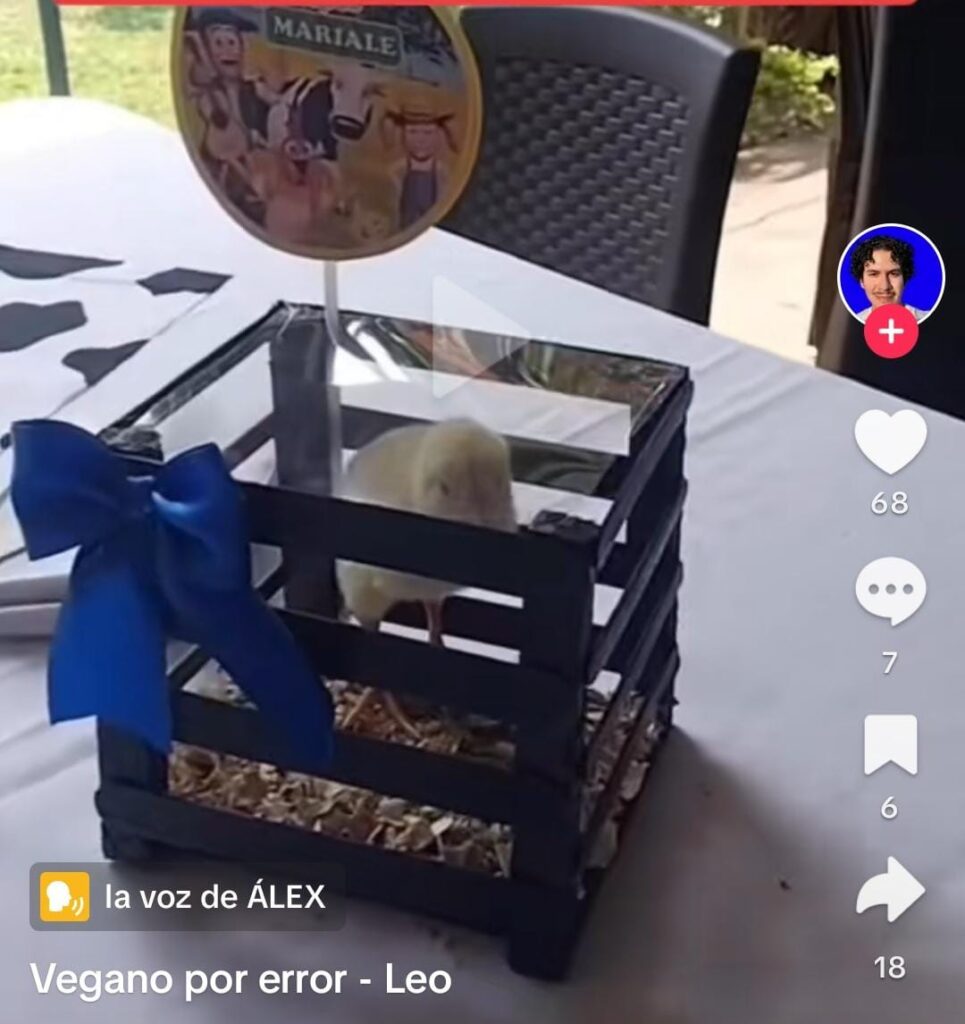 Indignación causó en redes sociales un video que ya es viral en el que se muestra a un pollito encerrado en un pequeño corral como un adorno de centro de mesa de una celebración.