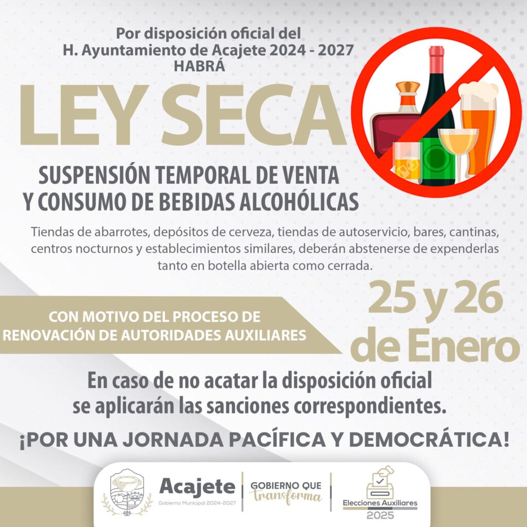 Acajete, Pue.- En cumplimiento con el artículo 271 del Código de Instituciones y Procesos Electorales del Estado de Puebla, el municipio de Acajete ha anunciado la implementación de la Ley Seca como medida oficial durante el proceso de plebiscitos para la renovación de Autoridades Auxiliares correspondientes al periodo 2025–2028.