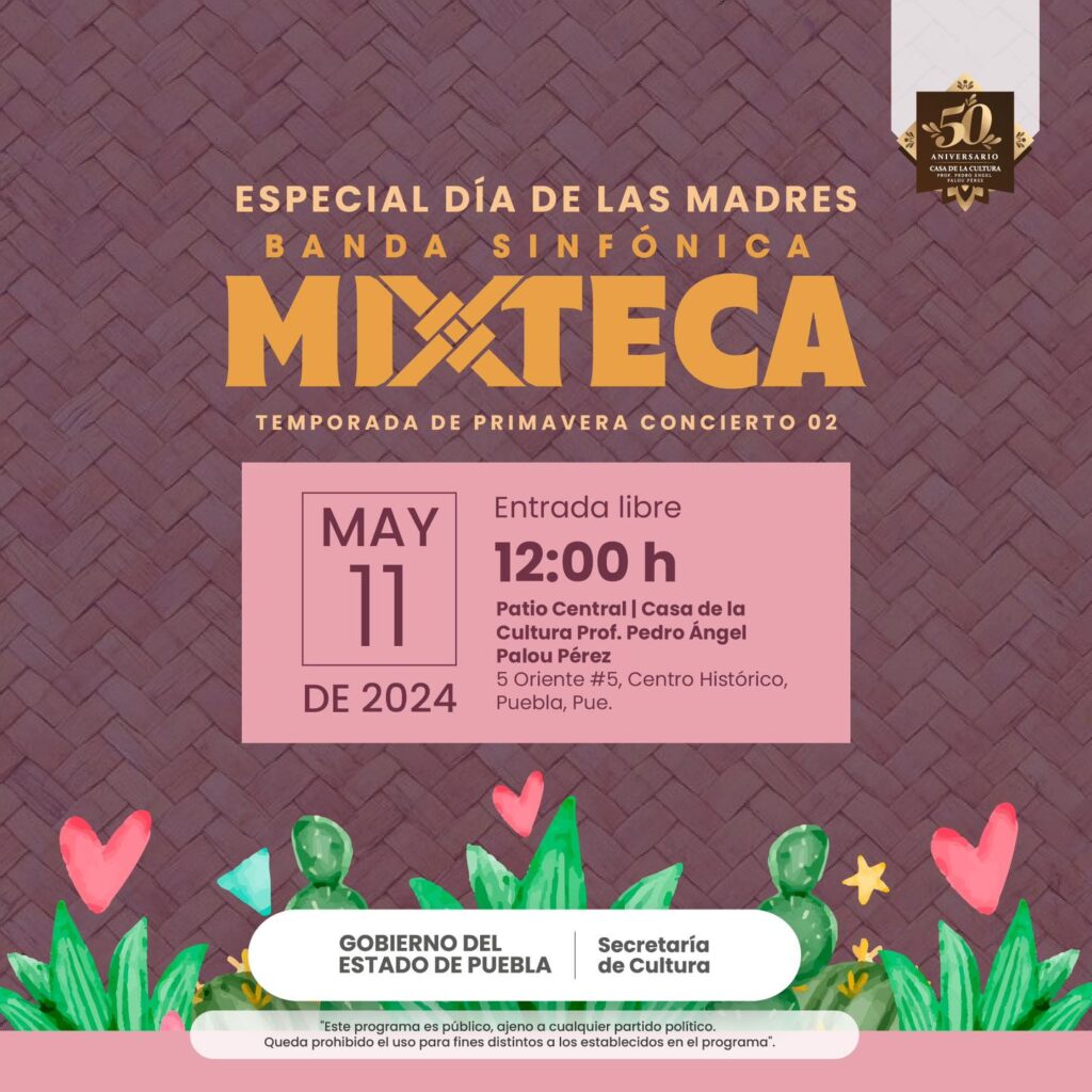 La segunda actividad será el día sábado 11 de mayo en la Casa de la Cultura “Profesor Pedro Ángel Palou Pérez”, ubicada en 5 Oriente número 5 y la cual incluirá una presentación especial de la Banda Sinfónica Mixteca, perteneciente a la Temporada de Primavera de la agrupación, la cual tendrá lugar a las 12:00 horas.