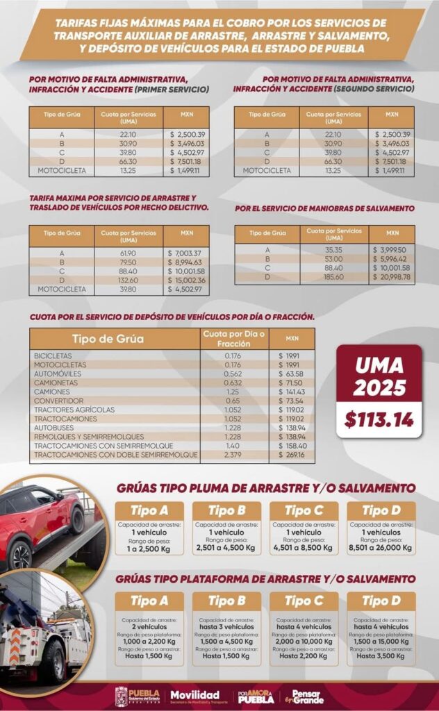 Puebla, Pue. — La Secretaría de Movilidad y Transporte del Estado de Puebla presentó este jueves las nuevas tarifas autorizadas para el servicio de grúas y uso de corralones, una medida con la que se busca eliminar cobros excesivos, brindar certeza jurídica a los usuarios y cerrar espacios a la corrupción.
