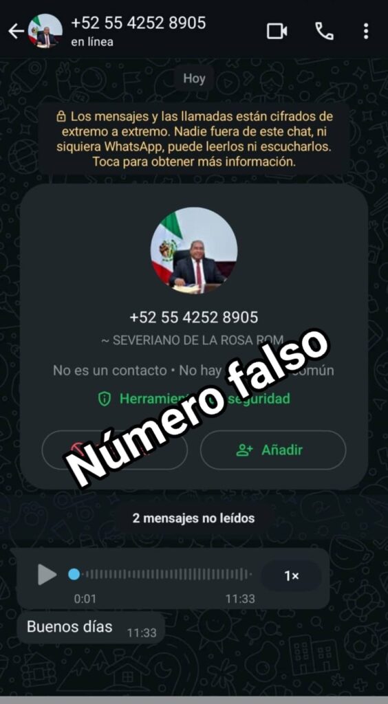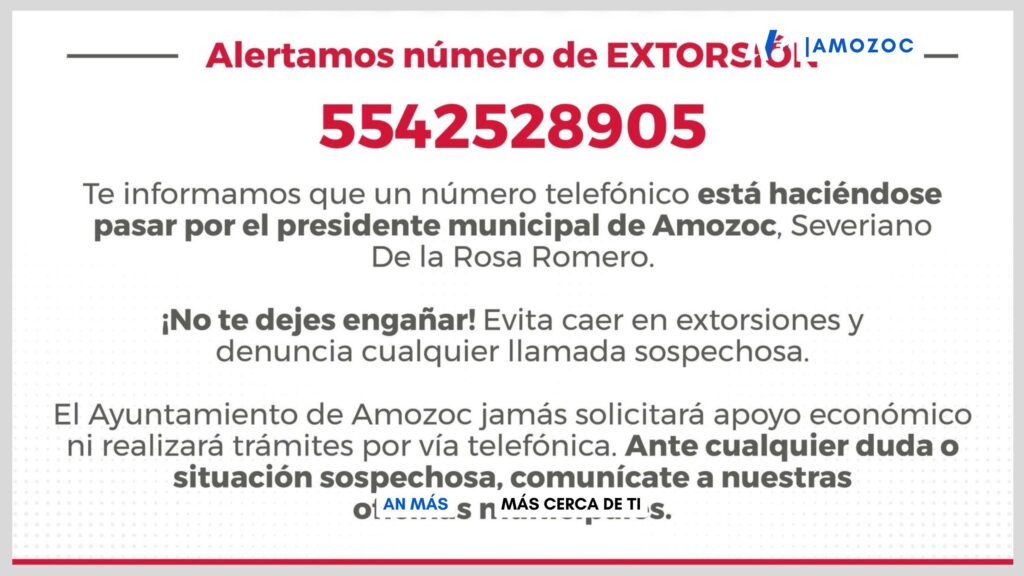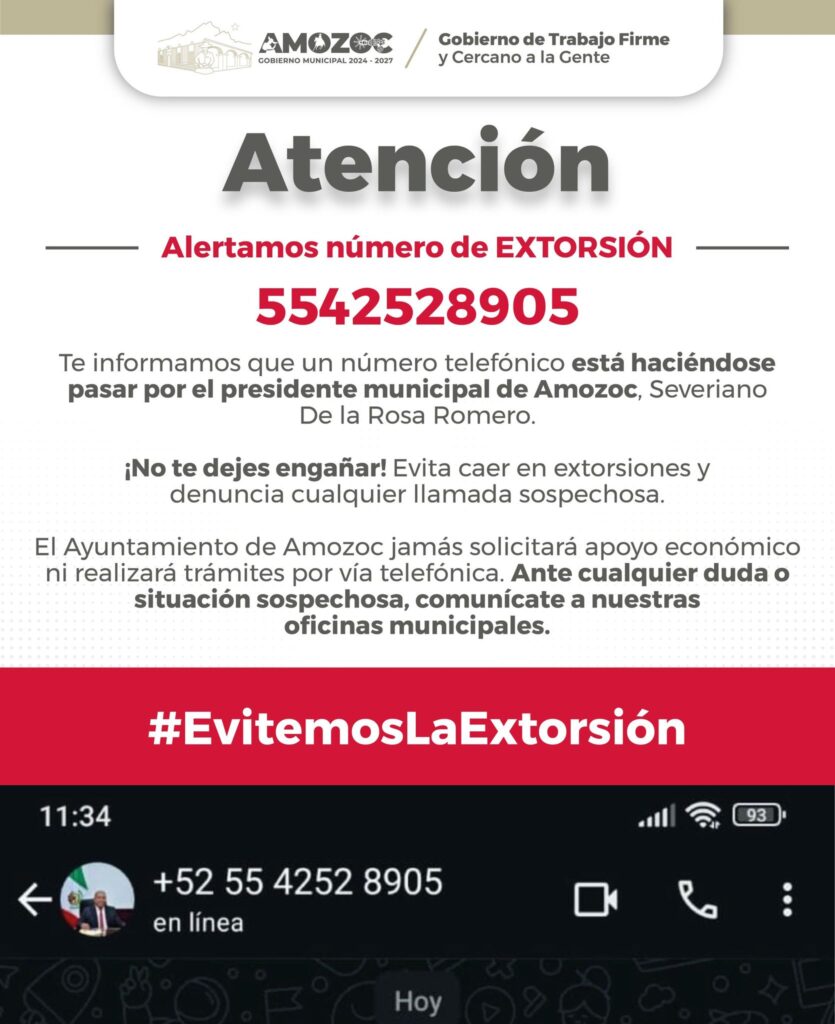 Amozoc de Mota, Puebla.- El presidente municipal de Amozoc, Severiano de la Rosa Romero, emitió una alerta a la ciudadanía debido a que un número telefónico, 5542528905, se está utilizando para realizar intentos de extorsión haciéndose pasar por él.