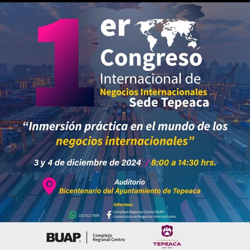 Tepeaca de Negrete.- Primer Congreso Internacional De Negocios Internacionales organizado por el Complejo Regional Centro BUAP Licenciatura en Negocios Internacionales, se llevará a cabo el próximo 3 y 4 de diciembre en el Auditorio Bicentenario
