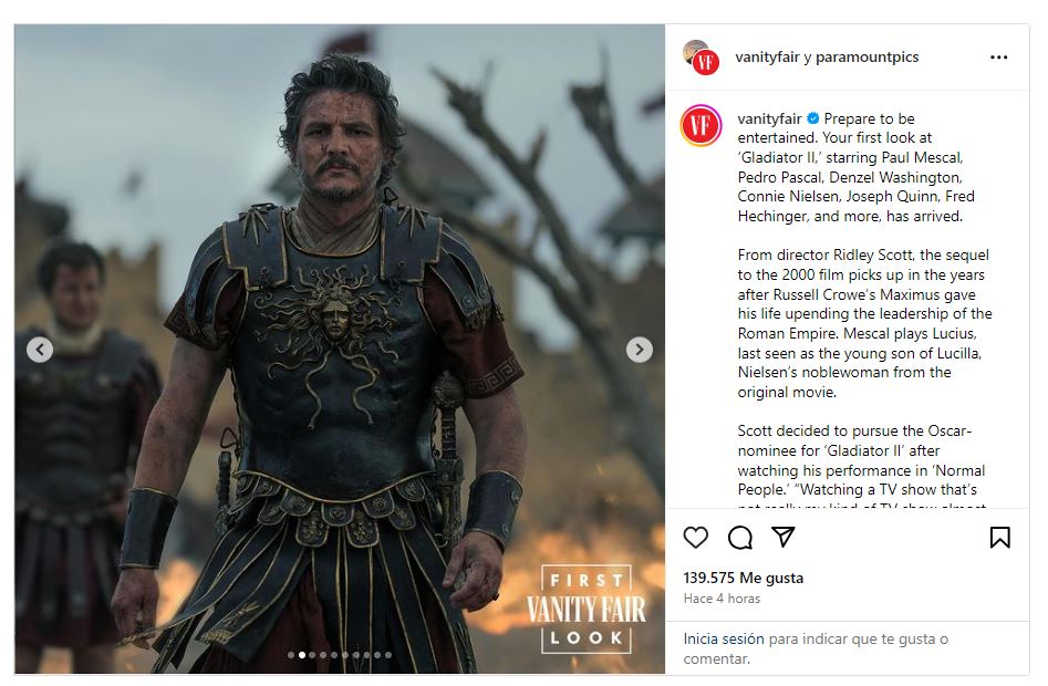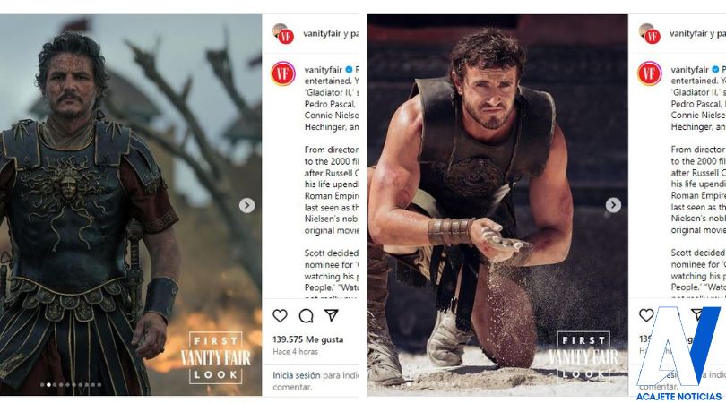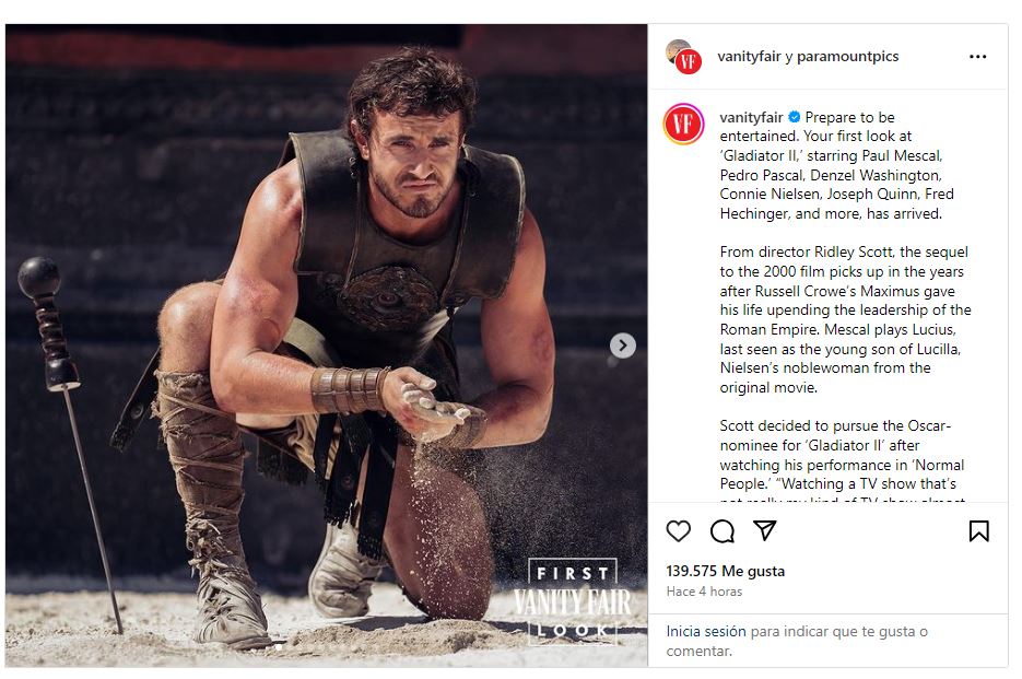 Vanity Fair ha compartido en exclusiva las primeras imágenes de Gladiator 2en las que podemos ver a Paul Mescal recogiendo el testigo de Russell Crowe, así como su enfrentamiento a Pedro Pascal en el Coliseo. En estas instantáneas también vemos un primer vistazo a los personajes interpretados por Joseph Quinn, Denzel Washington y Connie Nielsen.