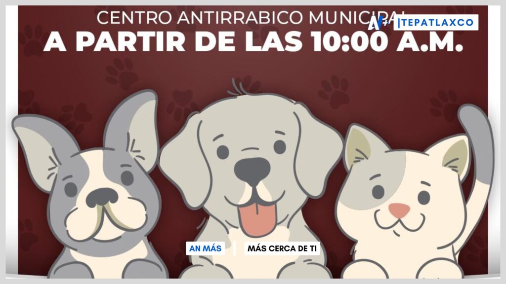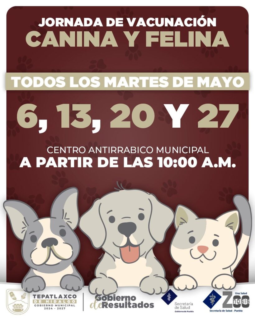 Tepatlaxco de Hidalgo, Puebla. – Con el compromiso de promover la salud pública y el bienestar animal, el Centro Antirrábico Municipal llevará a cabo la Jornada de Vacunación Antirrábica Canina y Felina todos los martes del mes de mayo, los días 13, 20 y 27, a partir de las 10:00 a.m.