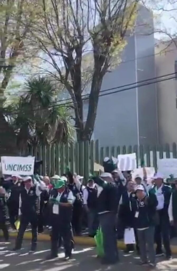 La mañana del miércoles, poco antes de las 10:00 horas, comenzaron a reunirse jubilados de la Unión Nacional de Comités IMSS (UNCIMSS) en el acceso principal de la 10 Poniente. Con cartulinas y consignas, exigían una audiencia con la presidenta para solicitar su intervención, pues señalaron que desde 2015 tienen retenido el dinero de sus Afores.