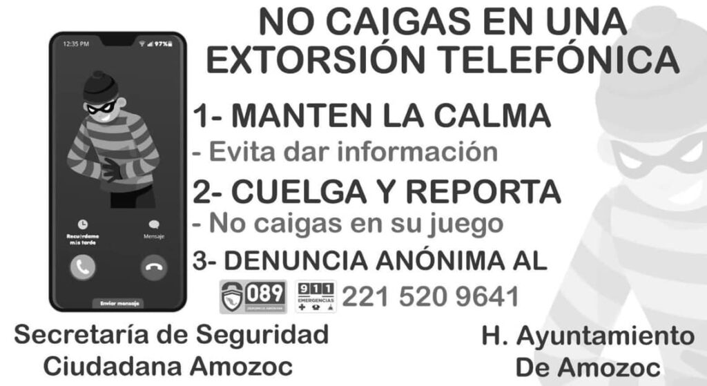 El ayuntamiento de Amozoc a través de la Secretaría de Seguridad Ciudadana (SSC) llamó a la ciudadanía en general a denunciar de manera anónima y segura al 089 o al número 221 520 96 41 a aquellos números telefónicos de donde hayan recibido la llamada; además, emitió diversas recomendaciones para evitar ser víctima de este delito que se ha incrementado en los últimos meses.