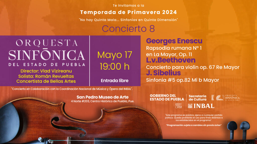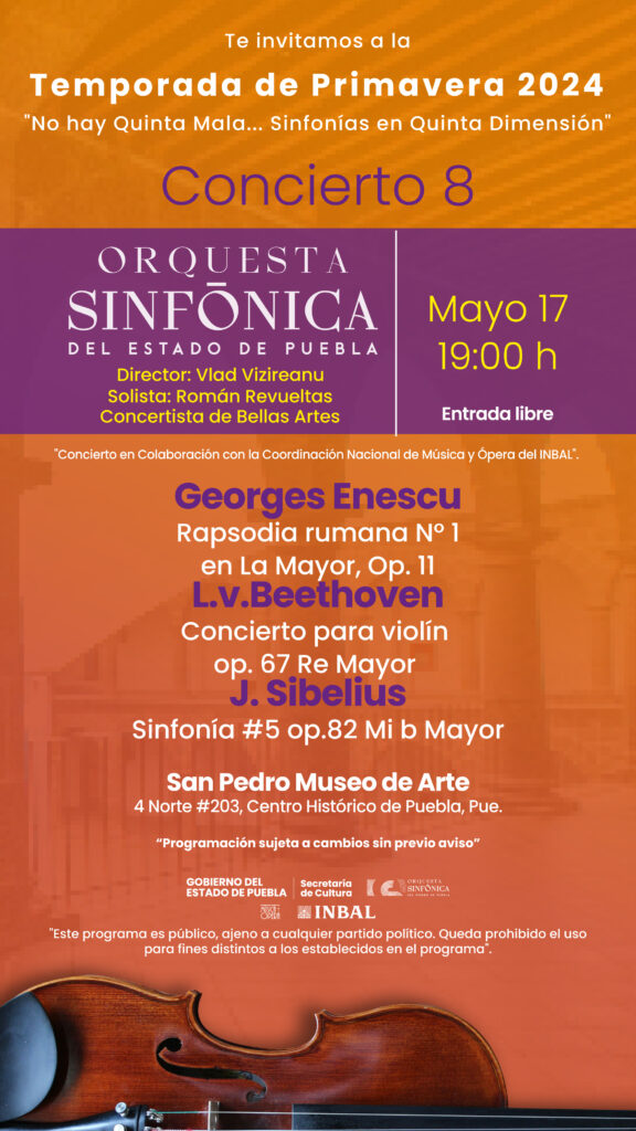 En el concierto número ocho de la Temporada de Primavera de la Orquesta Sinfónica del Estado de Puebla (OSEP), la agrupación compartirá escenario con el director internacional, Vlad Vizireanu y el solista al violín, Román Revueltas, concertista de Bellas Artes, informa la Secretaría de Cultura.