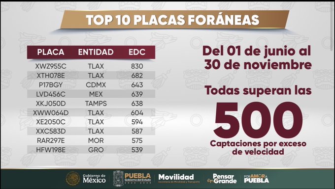En 6 meses #Puebla registró 5 millones 693 mil 653 fotomultas por exceso de velocidad, de las cuales 4 millones 94 mil 572 corresponden a autos con placas foráneas, dónde un auto de #Tlaxcala registró casi un… pic.twitter.com/d1XElRWdI1