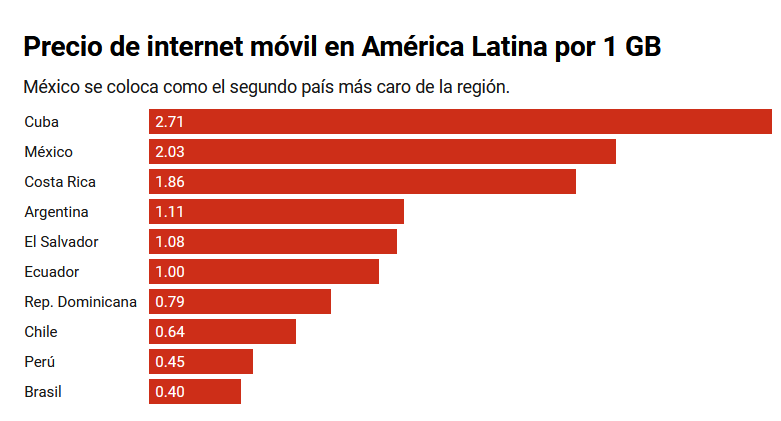 Según por lo mencionado, el costo promedio de un gigabyte en México es de 2.03 dólares (aproximadamente 37 pesos), solo superado por Cuba con 2.71 dólares. En contraste, Colombia es el más accesible, con un costo de 0.20 dólares por gigabyte. A nivel mundial, nuestro país ocupa el puesto 162 en términos de costos de datos móviles, a pesar de las significativas inversiones en infraestructura de telecomunicaciones. Entre 2020 y 2022, se invirtieron más de 107 millones de pesos, con el 72.7% destinado a infraestructura.