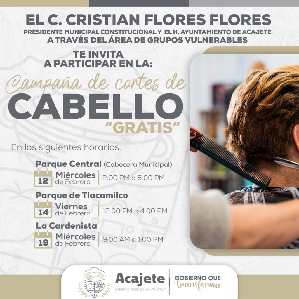 Acajete, Puebla. – Con el objetivo de brindar apoyo a la comunidad y fomentar el bienestar social, el Gobierno Municipal de Acajete, encabezado por el presidente Cristian Flores Flores, ha organizado la “Jornada de Cortes de Cabello Gratis”. Esta iniciativa, impulsada a través del área de Grupos Vulnerables, busca beneficiar a la población con un servicio esencial sin costo alguno.