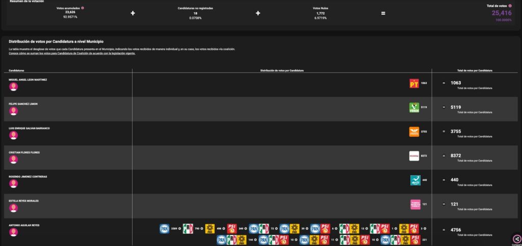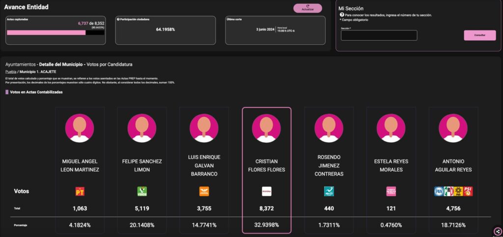 Acajete.- El día de hoy y con corte a las 03:00 h UTC-6 el El Programa de Resultados Electorales Preliminares (PREP) continua posicionando en PRIMER LUGAR a Cristian Flores Flores candidato de MORENA, con un total de votos preliminar de 8,372 (32.9398%).