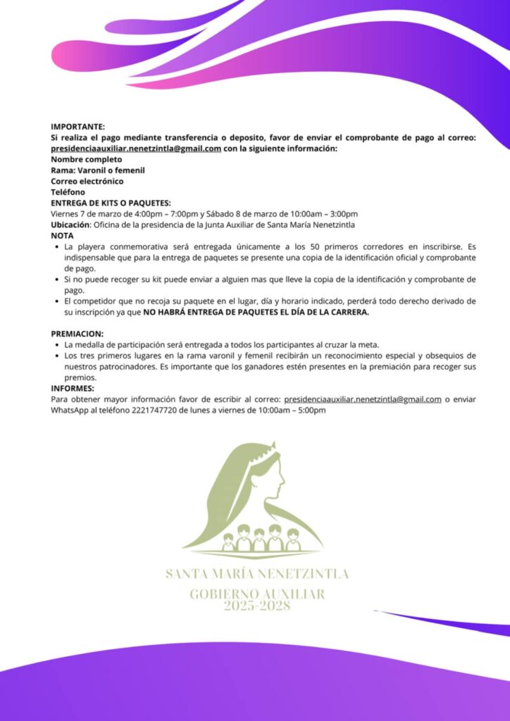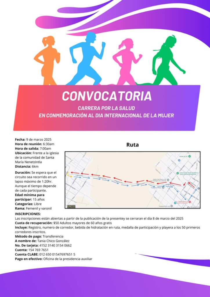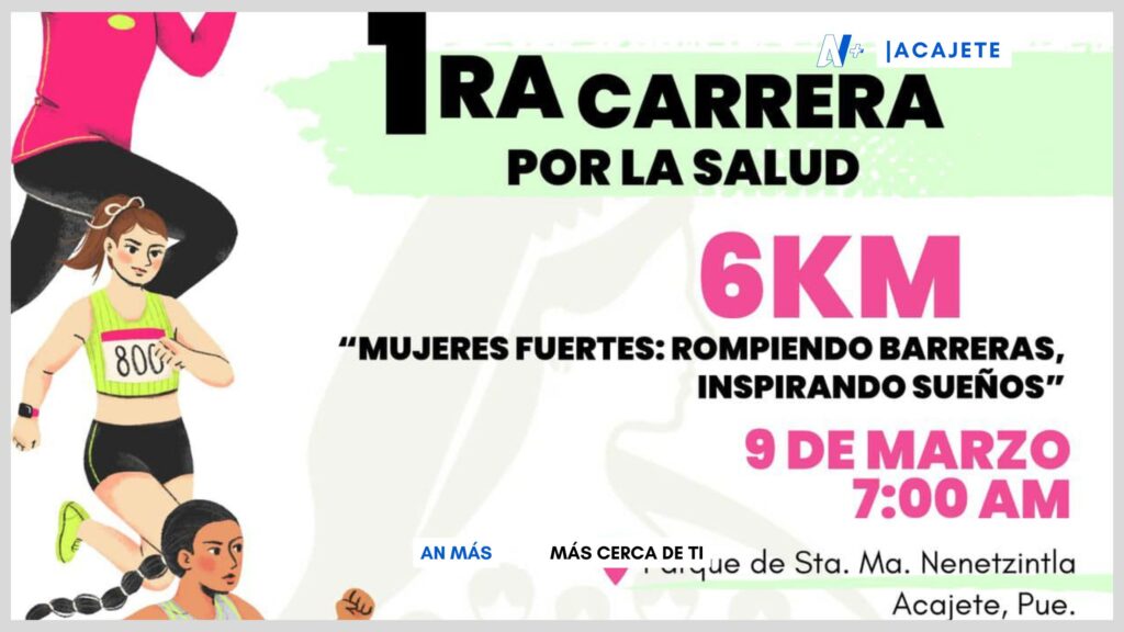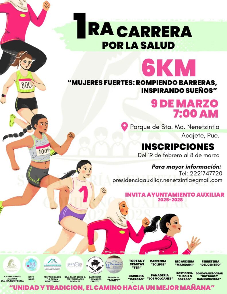 Santa María Nenetzintla, Acajete. – El Ayuntamiento Auxiliar de Santa María Nenetzintla y el presidente auxiliar Jibran Sánchez Aguilar invitan a la comunidad a participar en la Primera Carrera por la Salud “Mujeres Fuertes: Rompiendo Barreras, Inspirando Sueños”, que se llevará a cabo el próximo 9 de marzo a las 7:00 a.m. en el parque de la comunidad.