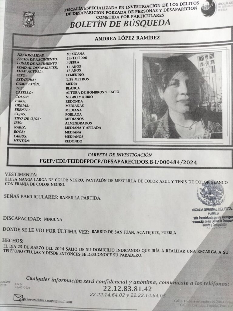 Se Busca a Andrea López Ramírez de 17 años de edad, hechos: el día 25 de marzo salió de su domicilio ubicado en Barrio San Juan, Acajete, Puebla, indicando que iría a realizar una recarga a su teléfono celular y desde entonces se desconoce su paradero, vestía pantalón blusa manga larga de color negro, pantalón de mezclilla color azul y tenis de color blanco con franja de color negro, como señas particulares tiene la barba partida.