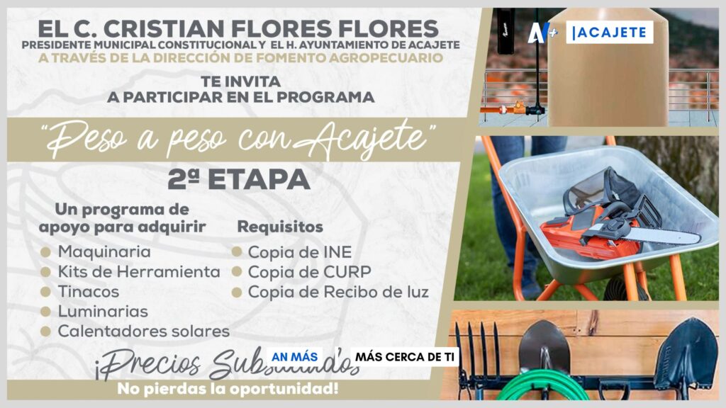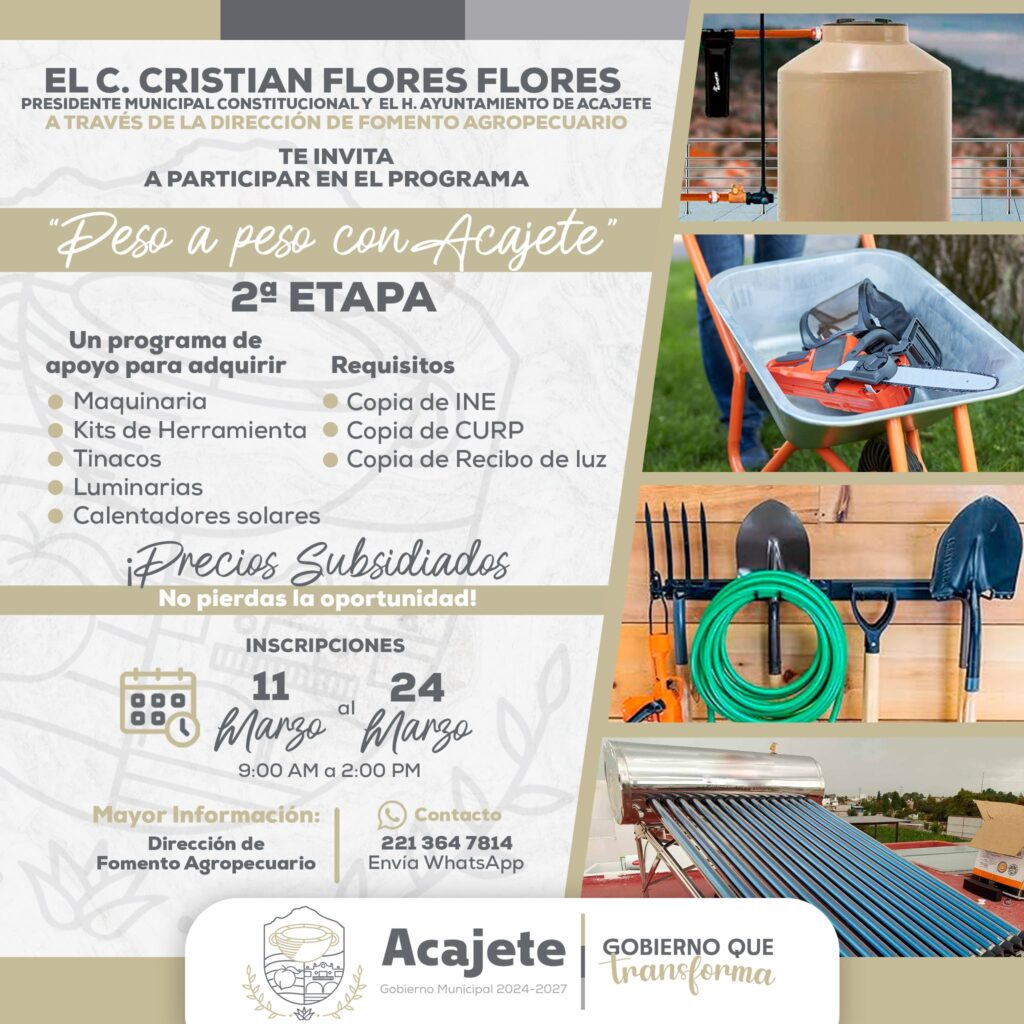 El H. Ayuntamiento de Acajete 2024 – 2027, encabezado por el presidente municipal Cristian Flores Flores, ha anunciado la apertura de la segunda etapa del programa “Peso a Peso con Acajete”, una iniciativa que busca apoyar a la población en la adquisición de maquinaria, kits de herramientas, tinacos, luminarias y calentadores solares a precios subsidiados.