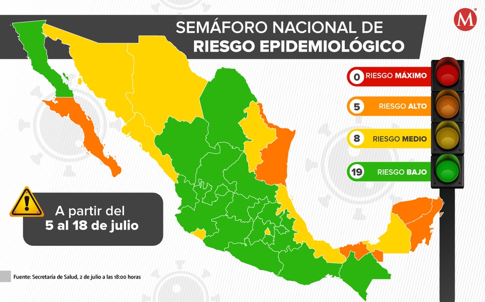 Los 19 estados que estarán en verde con riesgo mínimo son: Aguascalientes, Baja California, Chiapas, Coahuila, Durango, Estado de México, Guanajuato, Guerrero, Hidalgo, Jalisco, Michoacán, Morelos, Nayarit, Oaxaca, Puebla, Querétaro, San Luis Potosí, Tlaxcala y Zacatecas.