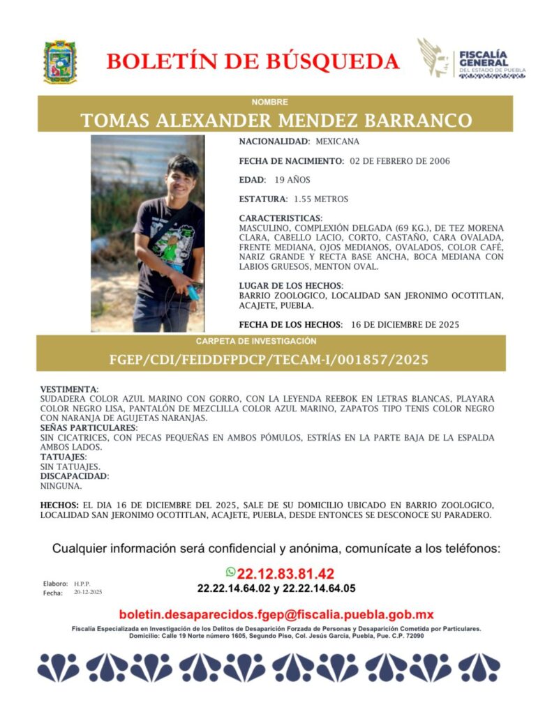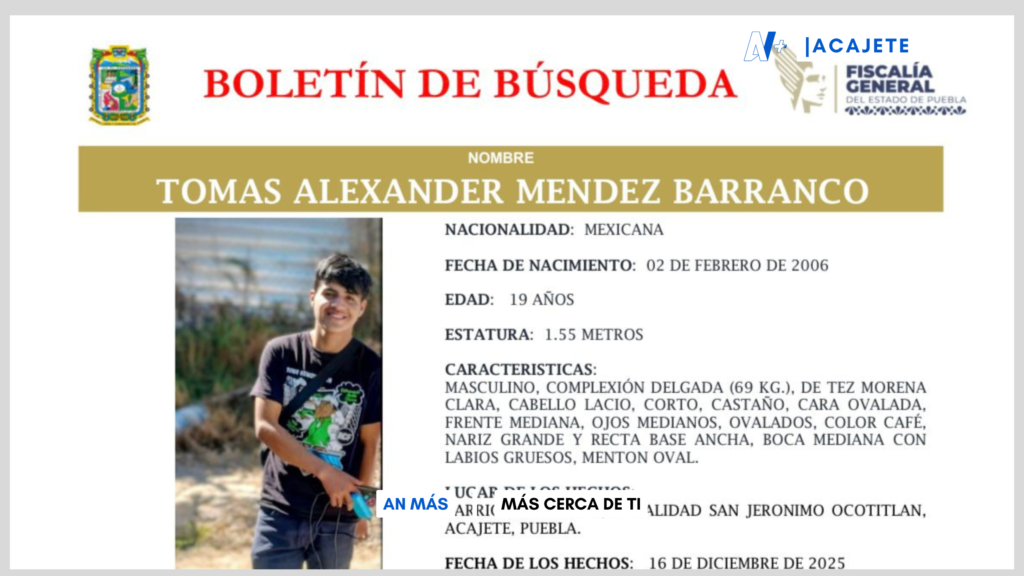 Acajete, Puebla.— La Fiscalía General del Estado de Puebla emitió un boletín de búsqueda para localizar a Tomás Alexander Méndez Barranco, joven de 19 años de edad, quien fue reportado como desaparecido desde el pasado 16 de diciembre de 2025.