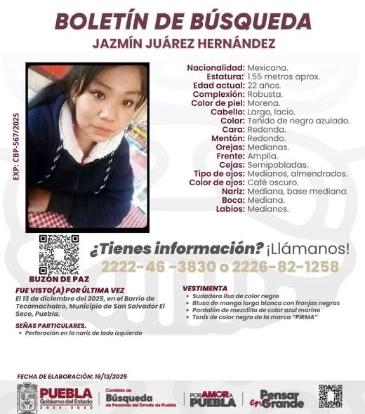 Las autoridades estatales mantienen activa la ficha de búsqueda de Jazmín Juárez Hernández, joven mexicana de 22 años de edad, quien fue reportada como desaparecida desde el pasado 13 de diciembre de 2025 en el barrio de Terracota, municipio de San Salvador El Seco, Puebla.