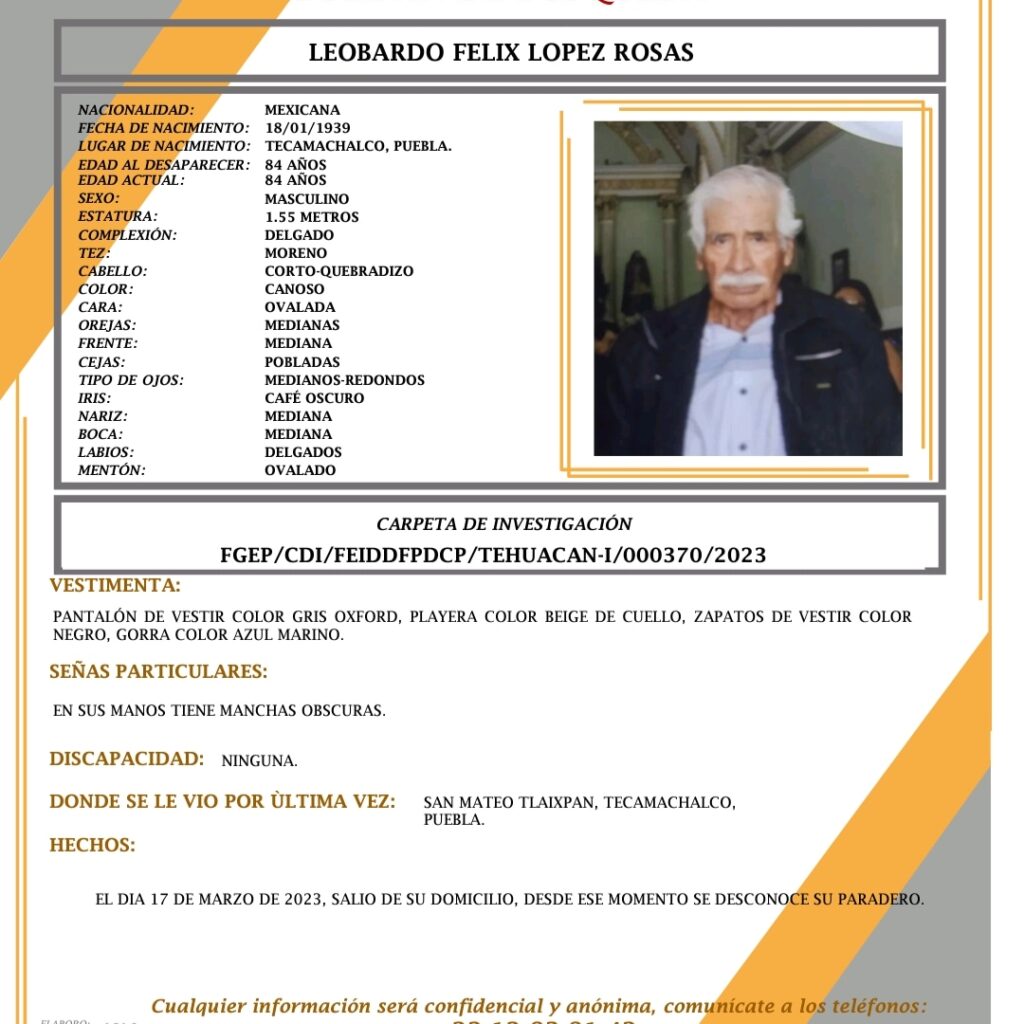 El señor Leobardo Felix López Rosas salió a la tienda y no ha regresado, de acuerdo a la información recabada salió a la tienda, no aparece desde las 2 de la tarde del día viernes, el hombre padece de perdida de memoria temporal, le agradezco su apoyo, cualquier información comunicarse al número 249 134 1281.