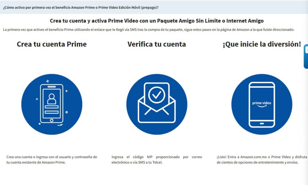 Para tener Amazon Prime Video gratis con las recargas Amigo Sin Límite es necesario activar el beneficio en la página web de Telcel. Después de comprar algunos de los paquetes participantes, el usuario recibirá un mensaje de confirmación notificando del beneficio Amazon Prime. Se debe seguir el enlace en ese mensaje, confirmar número telefónico en la página web y se proporcionará un NIP por correo o SMS de verificación de cuenta (solo la primera vez).