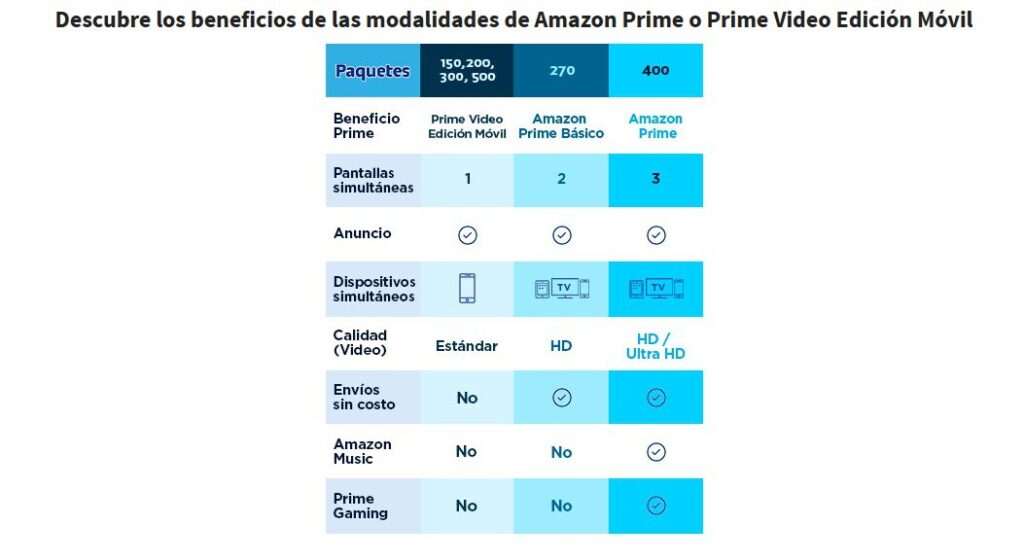 Hay otras dos recargas adicionales, diferentes de las tradicionales, que incluyen Prime Video y otros beneficios de Amazon Prime. La recarga Amigo Sin Límite 270 incluye Amazon Prime Básico, es decir que además de las películas y series de Prime Video, también ofrece envíos sin costo. Finalmente, la recarga Amigo Sin Límite 400 incluye Amazon Prime por completo, es decir, además de Prime Video con calidad Ultra HD en tres pantallas simultáneas, envíos gratis, ofrece Amazon Music, y Prime Gaming.
