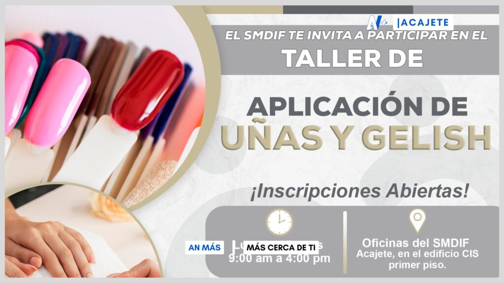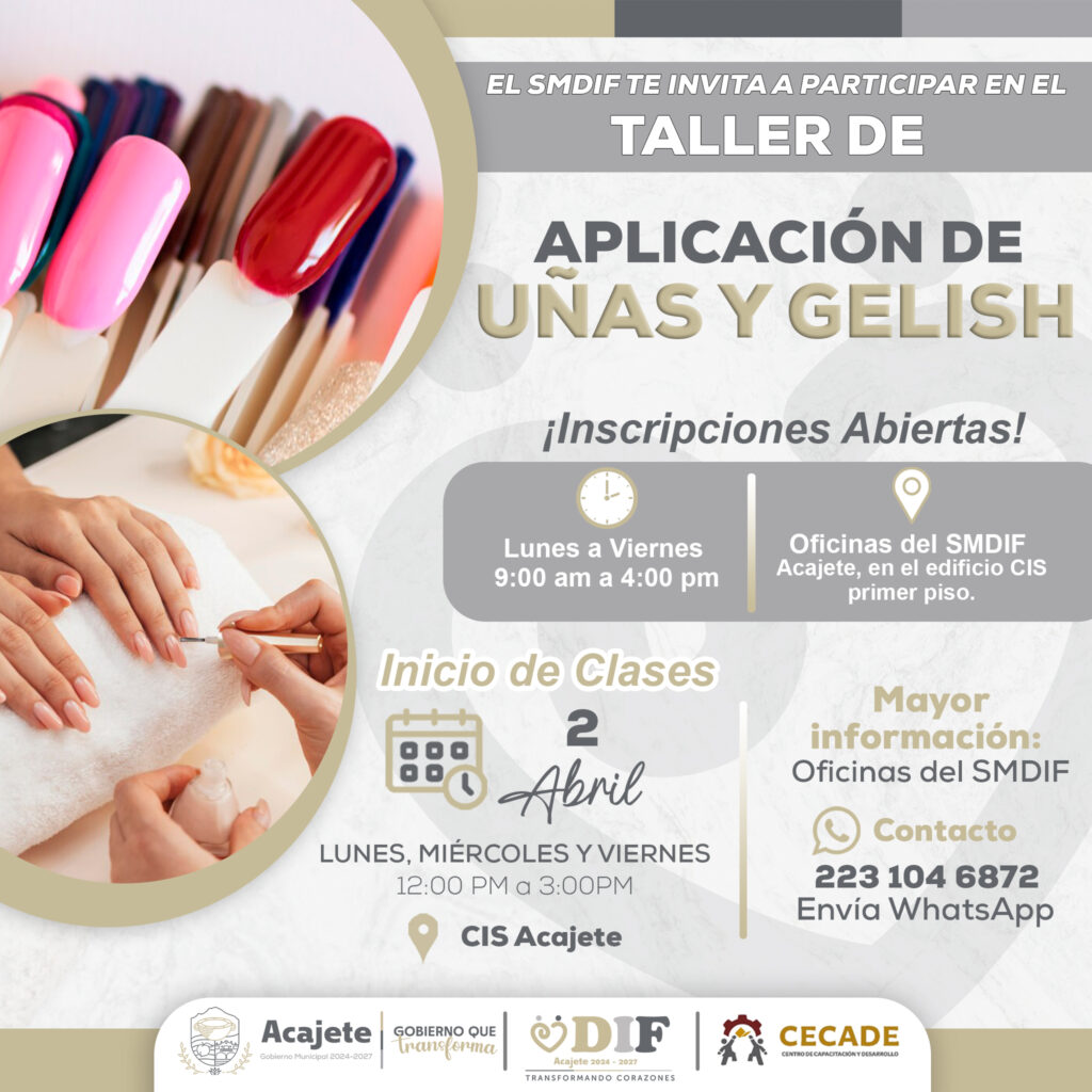 El Sistema Municipal DIF de Acajete, en colaboración con el Centro de Capacitación y Desarrollo (CECADE), invita a la población a inscribirse en el Taller de Aplicación de Uñas y Gelish, una excelente oportunidad para adquirir nuevas habilidades y aprender a generar ingresos a través del emprendimiento.