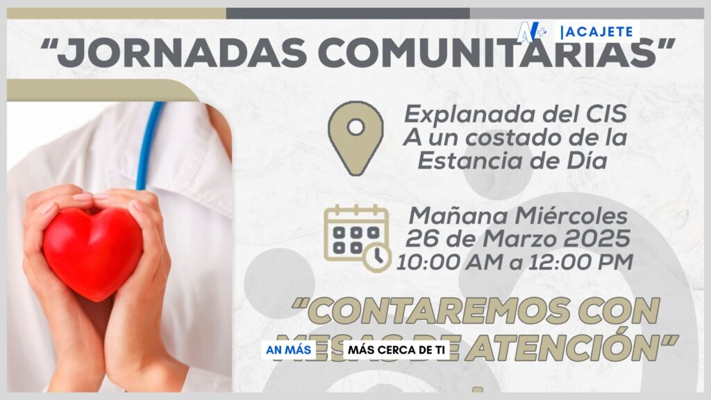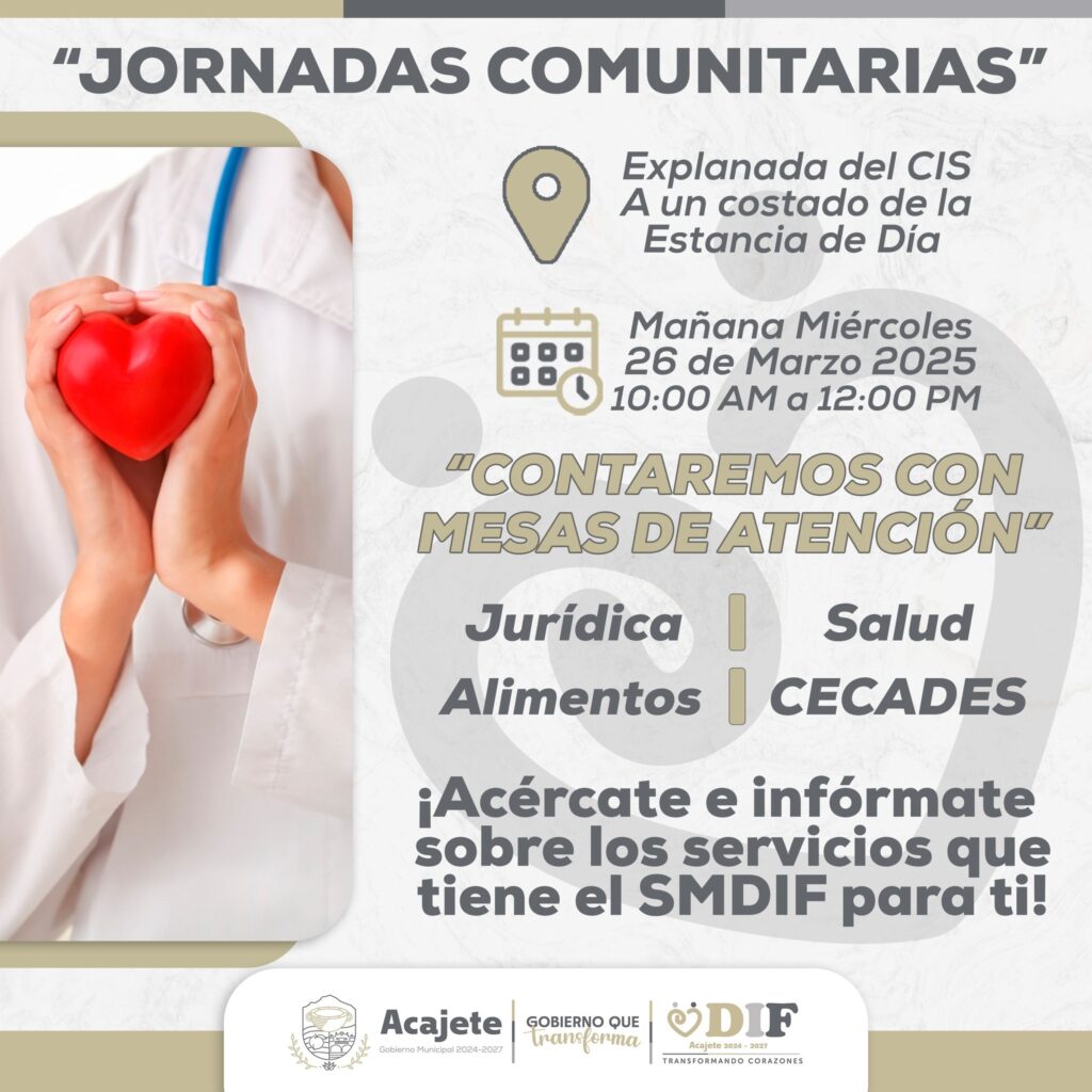 El Sistema Municipal para el Desarrollo Integral de la Familia (SMDIF) Acajete invita a la ciudadanía a participar en las Jornadas Comunitarias, un evento diseñado para brindar orientación en temas de atención jurídica, salud, alimentación y capacitación, en colaboración con el CECADES.