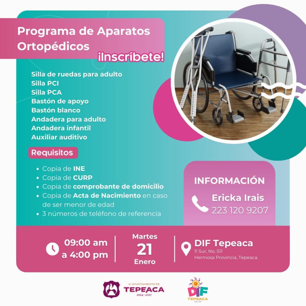 Tepeaca de Negrete, Pue.- El Sistema Municipal para el Desarrollo Integral de la Familia (SMDIF) de Tepeaca invita a la comunidad a inscribirse en el Programa de Aparatos Ortopédicos. Este programa ofrecerá diferentes ayudas para quienes las necesiten, tales como:
