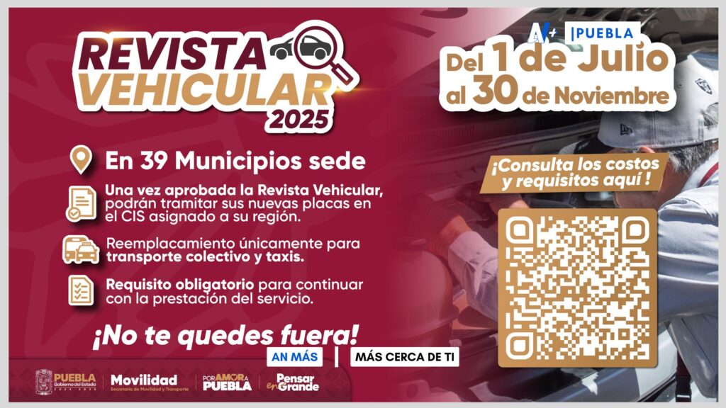 La Secretaría de Movilidad y Transporte (SMT) del estado de Puebla dio a conocer los requisitos que deberán cumplir los operadores del transporte público y mercantil para participar en la Revista Vehicular 2025, que se llevará a cabo del 1 de julio al 30 de noviembre en 39 municipios sede.