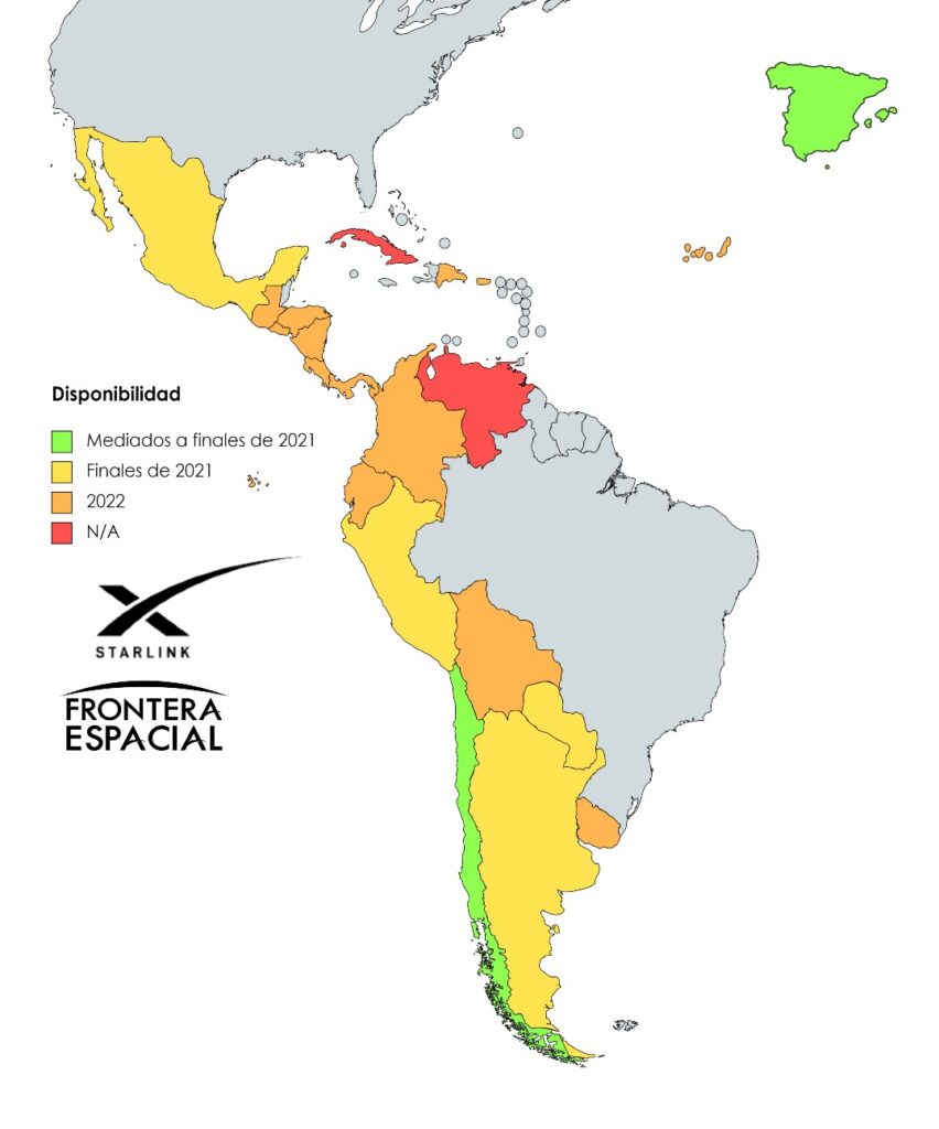 Los países que pueden recibir Starlink entre mediados de este año son Chile, España (península) y a finales de 2021 son Argentina, Paraguay, Perú, México.