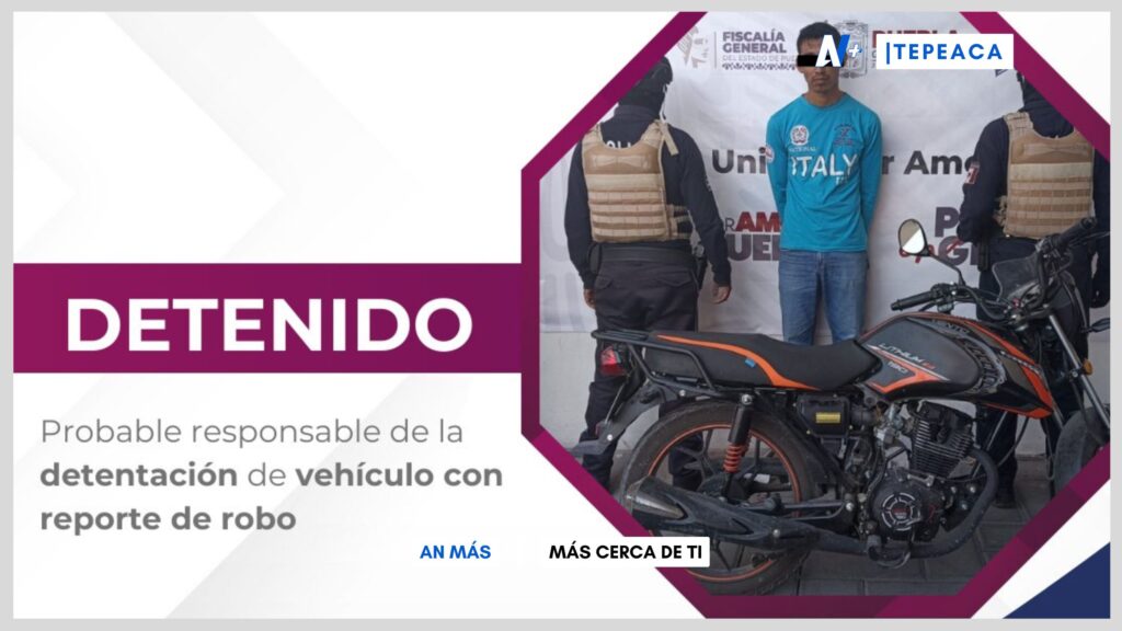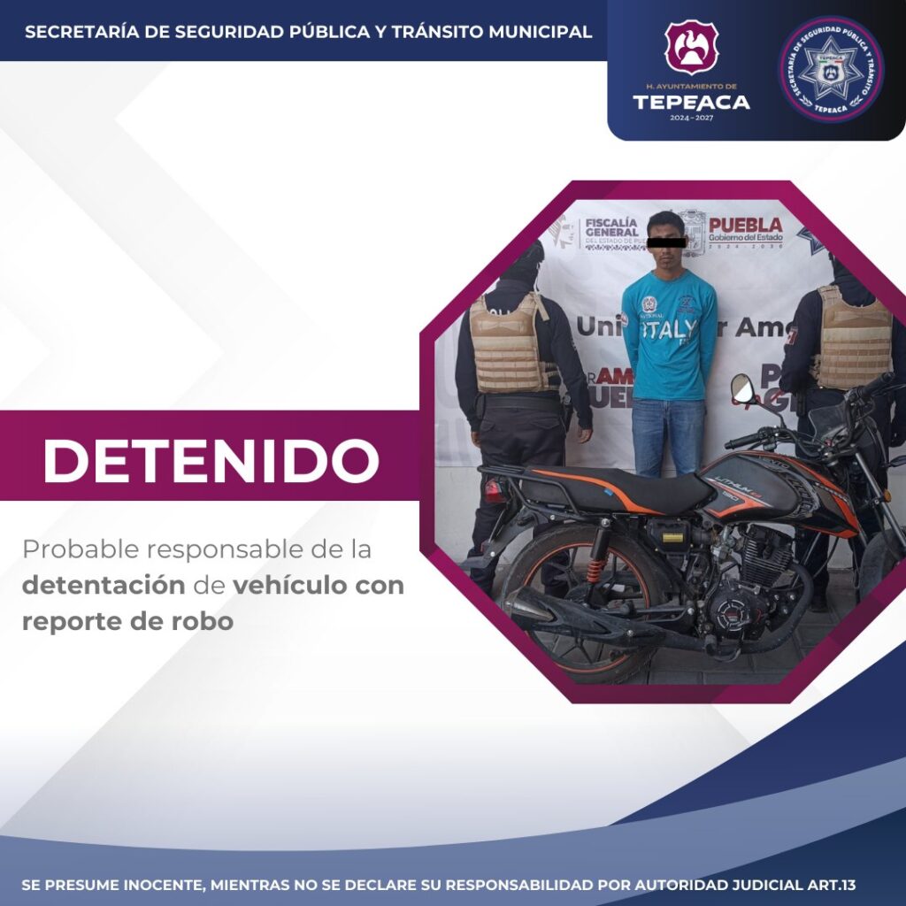 Tepeaca de Negrete, Pue. – La Secretaría de Seguridad Pública y Tránsito de Tepeaca informó que, como resultado de trabajos de inteligencia, se logró la detención de un hombre por la posesión de un vehículo con reporte de robo.