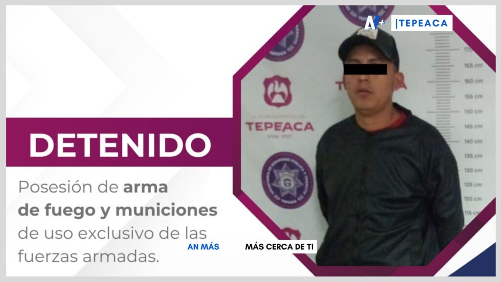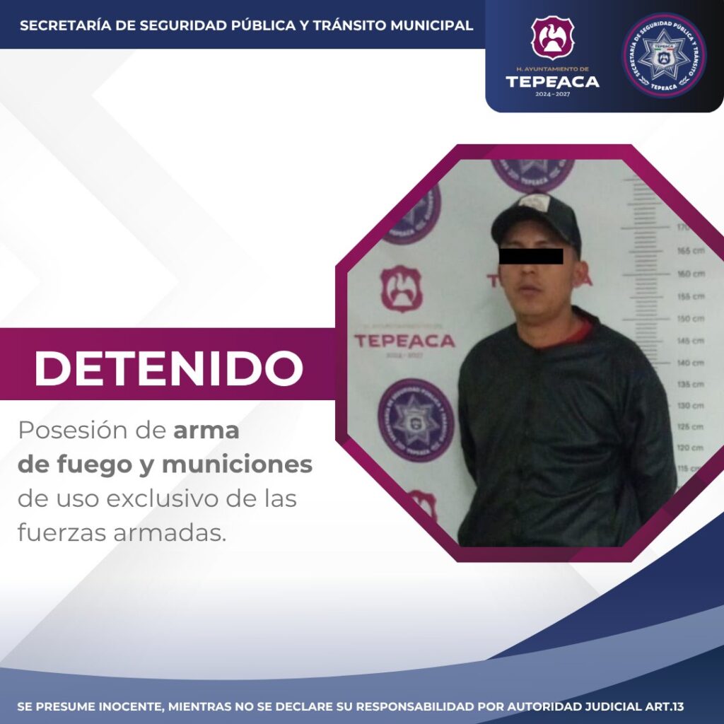Tepeaca, Pue. – Gracias al trabajo coordinado entre la Secretaría de Seguridad Pública y Tránsito Municipal de Tepeaca y la Secretaría de Marina (SEMAR), se logró una detención significativa durante labores de vigilancia nocturna en la cabecera municipal.