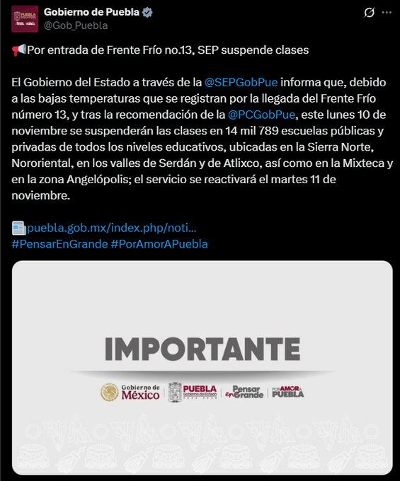De acuerdo con la Coordinación General de Protección Civil, el frente frío No. 30 ocasionará fuertes vientos y lluvias, lo que representa un riesgo para estudiantes, docentes y personal educativo. Por ello, se determinó suspender actividades presenciales en instituciones de educación básica, media superior y superior de 64 municipios.