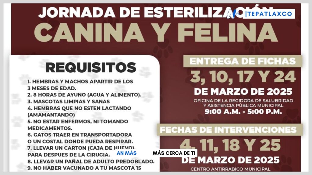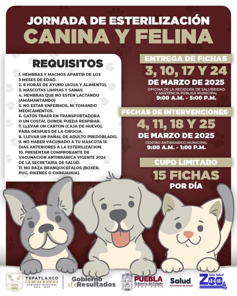 El H. Ayuntamiento de Tepatlaxco de Hidalgo, a través de la Regiduría de Salubridad y Asistencia Pública, invita a todos los habitantes a participar en la Campaña de Esterilización de Mascotas, que se llevará a cabo durante el mes de marzo.