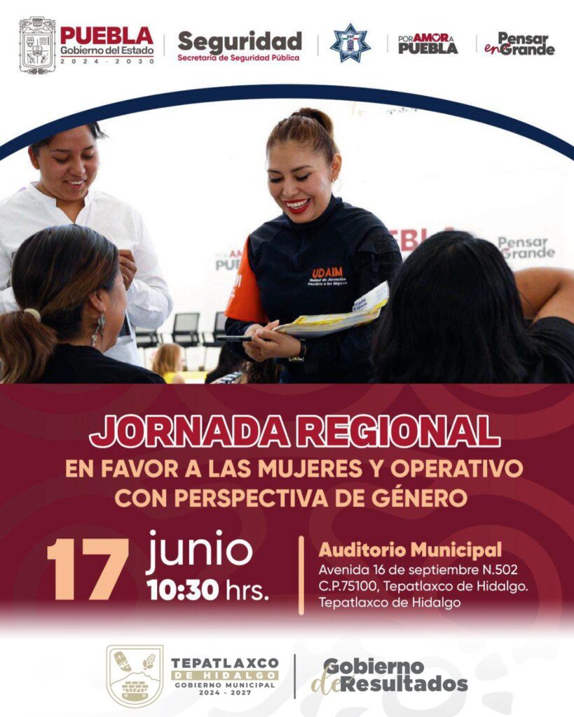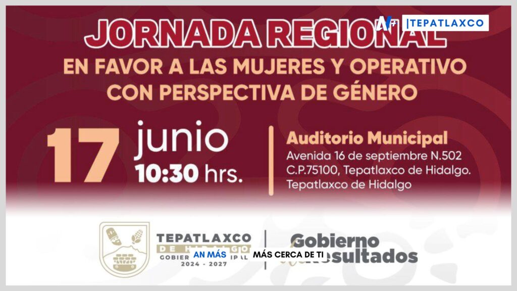Con el firme compromiso de avanzar hacia una sociedad más justa e igualitaria, el H. Ayuntamiento de Tepatlaxco de Hidalgo invita a la ciudadanía a participar en la Jornada Regional en Favor de las Mujeres, que se llevará a cabo el próximo 17 de junio a las 10:30 horas, en el auditorio municipal, ubicado en Av. 16 de septiembre n.° 502.