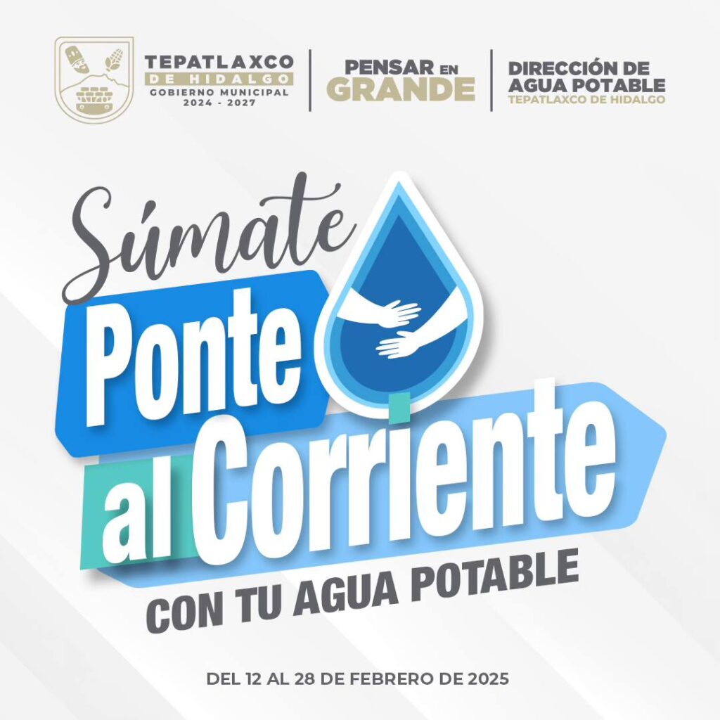 El H. Ayuntamiento de Tepatlaxco de Hidalgo ha lanzado el programa “Ponte al corriente con el pago de tu agua potable”, una oportunidad única para regularizar adeudos y asegurar el acceso al servicio. Este programa estará vigente del hasta el 28 de febrero de 2025, ofreciendo descuentos y beneficios para los ciudadanos.
