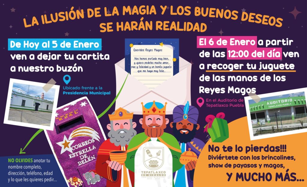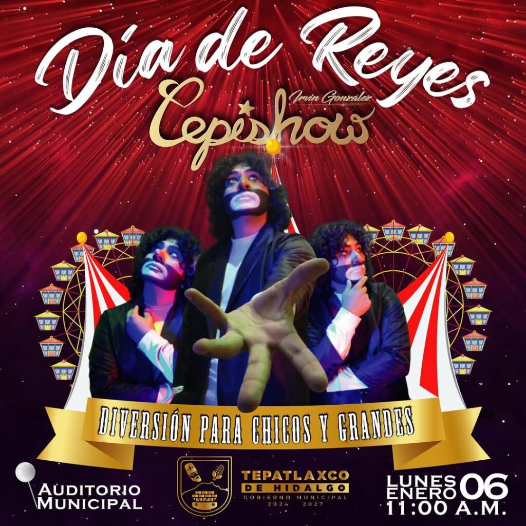 Tepatlaxco de Hidalgo.- El día de hoy el H. Ayuntamiento de Tepatlaxco te invita a celebrar el día de reyes a partir de las 11:00 a.m. en el Auditorio Municipal en donde se llevará acabo el show “Cepishow” y a medio día será la gran entrega de juguetes, además habrá brincolines, show de payasos y magos.