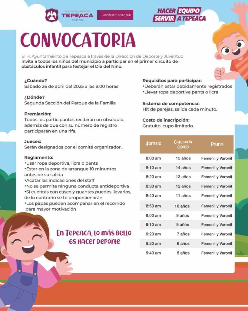 La inscripción es completamente gratuita y puede realizarse a través del siguiente enlace: https://tepeaca.gob.mx/…/circuito-de-obstaculos-infantil/