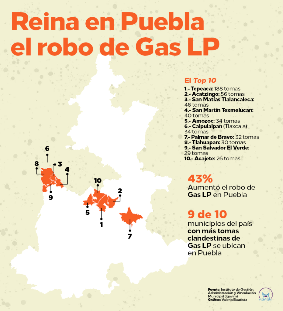 Tepeaca es el municipio con más tomas clandestinas de gas licuado en el país, pero también el segundo a nivel nacional con más robo a ductos de Pemex, según datos analizados por el Instituto de Gestión, Administración y Vinculación Municipal (Igavim).