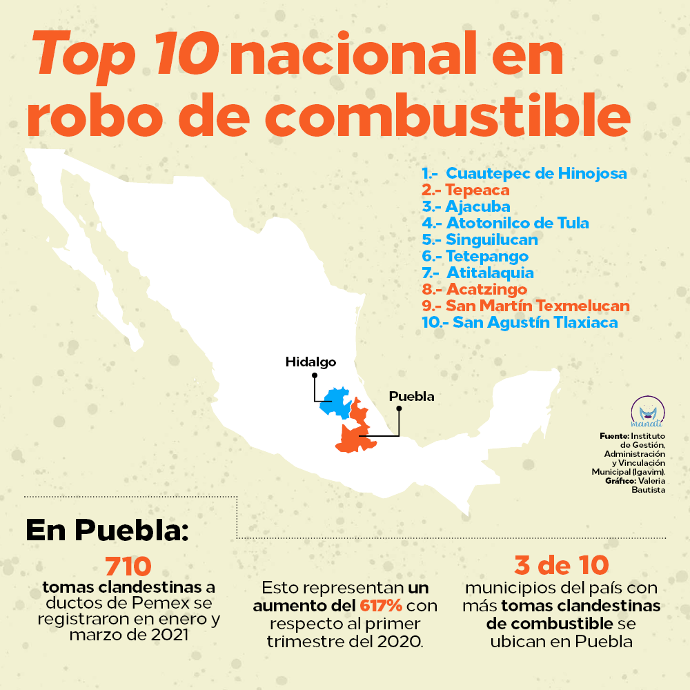 Además de Tepeaca y Acatzingo, en el listado de los 100 municipios del país con más incidencia de robo de combustible aparecen San Martín Texmelucan, Palmar de Bravo, San Matías Tlalancaleca, Acajete, Amozoc, Tlahuapan, Los Reyes de Juárez, Ahuazotepec, Quecholac, San Salvador El Verde, Esperanza, Huejotzingo.