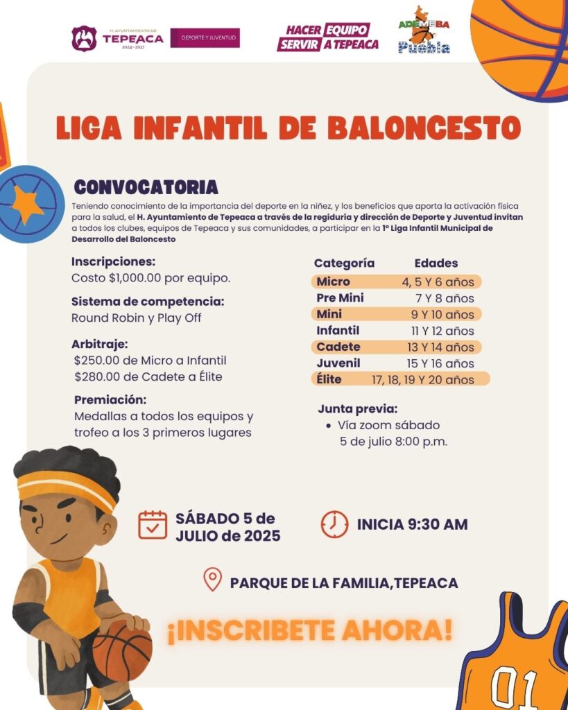 Este sábado 5 de julio, el deporte toma protagonismo en Tepeaca con el emocionante arranque de la 1ra Liga Infantil Municipal de Baloncesto, un proyecto deportivo que busca impulsar el talento y la sana convivencia desde temprana edad.