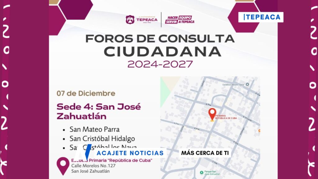 El H. Ayuntamiento de Tepeaca invita a toda la ciudadanía a participar en los Foros de Consulta Ciudadana 2024-2027, una iniciativa que busca integrar las opiniones y propuestas de los habitantes en el desarrollo del municipio.