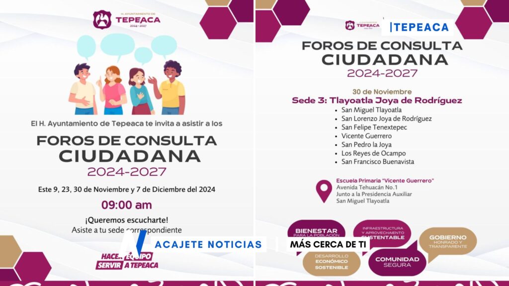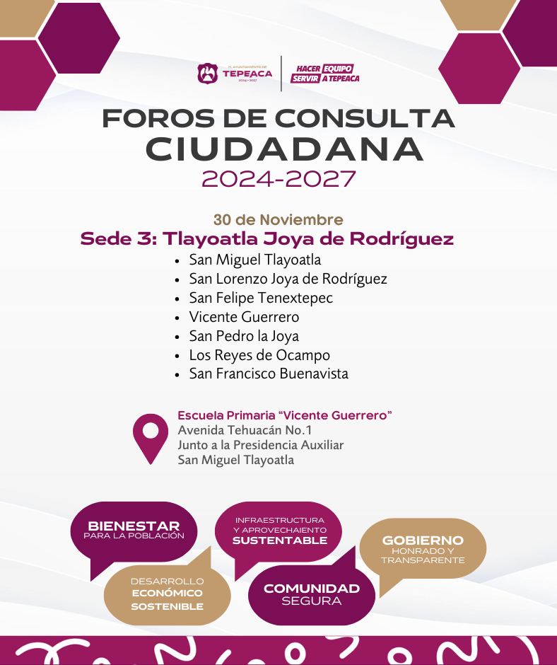 La cita es mañana sábado 30 de noviembre a partir de las 09:00 horas a la tercera jornada de foros ciudadanos que se llevará a cabo en la Escuela Primaria Vicente Guerrero.