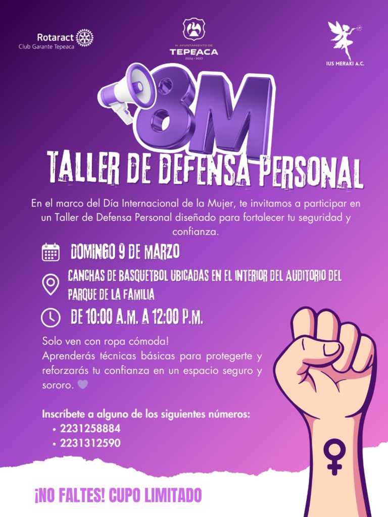 En el marco del Día Internacional de la Mujer, el Club Rotaract Garante Tepeaca, en colaboración con Ius Meraki A.C., invita a todas las mujeres de la comunidad a participar en un taller gratuito de defensa personal.
