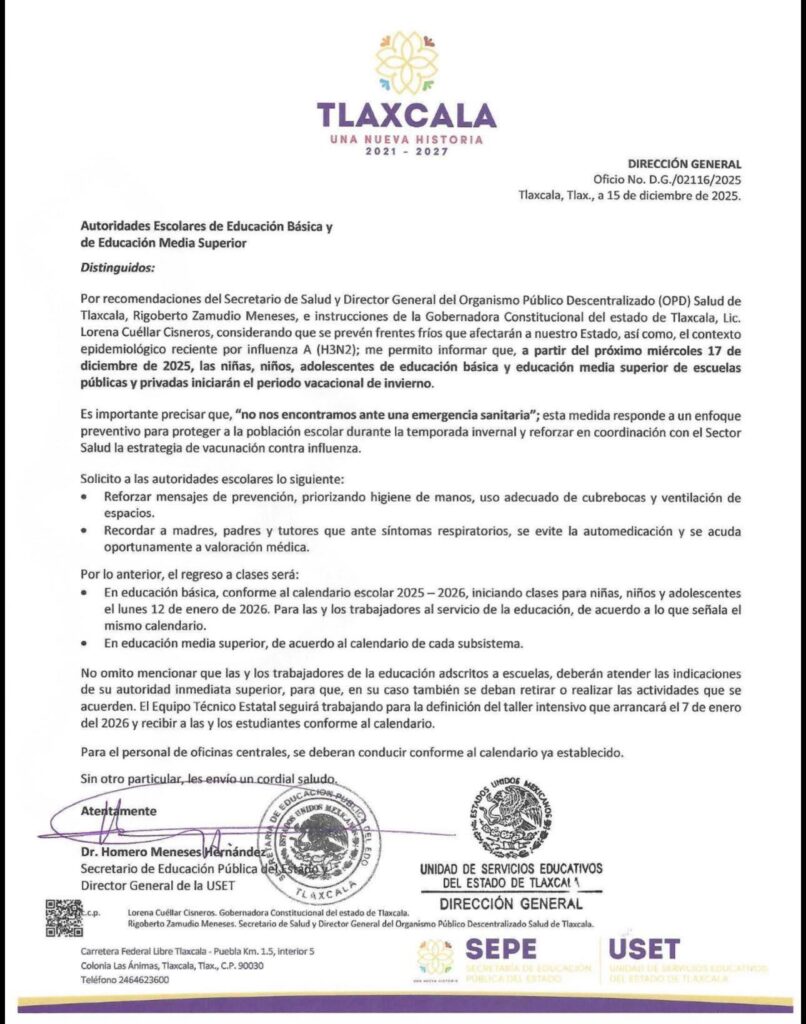 Continuando con temas de salud, autoridades del estado de Tlaxcala informaron que, debido al pronóstico de frentes fríos y al contexto epidemiológico por influenza A H3N2, se determinó adelantar el inicio del periodo vacacional de invierno para la comunidad escolar.