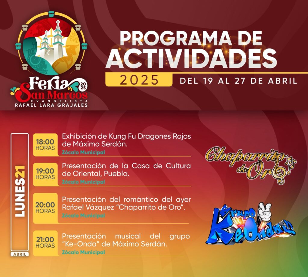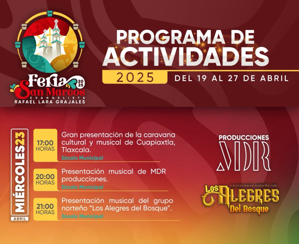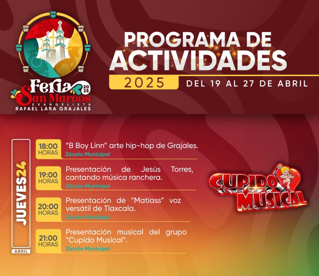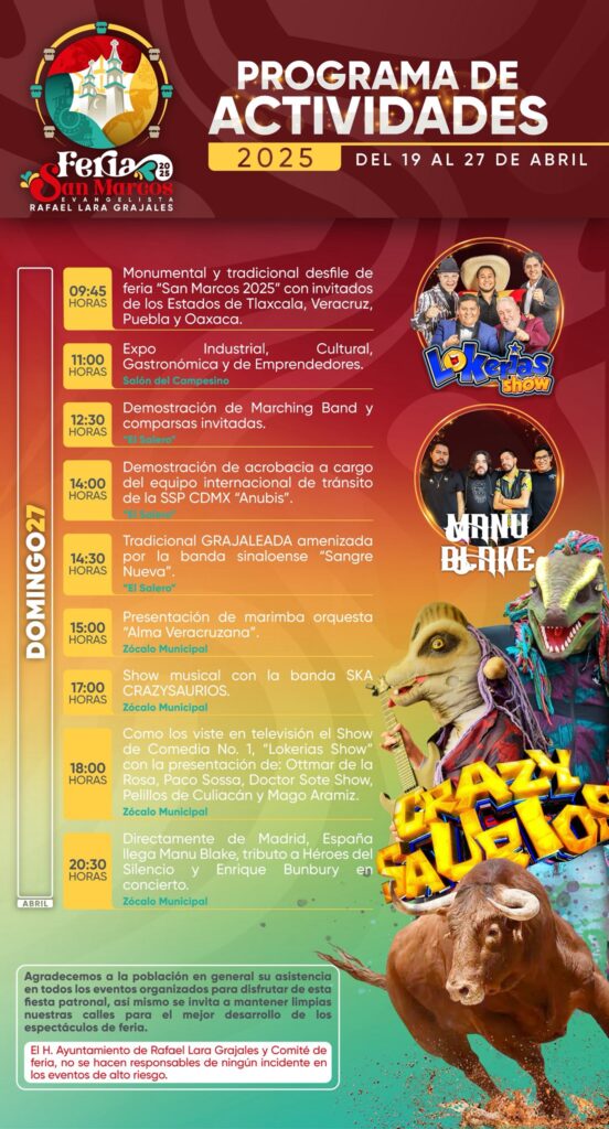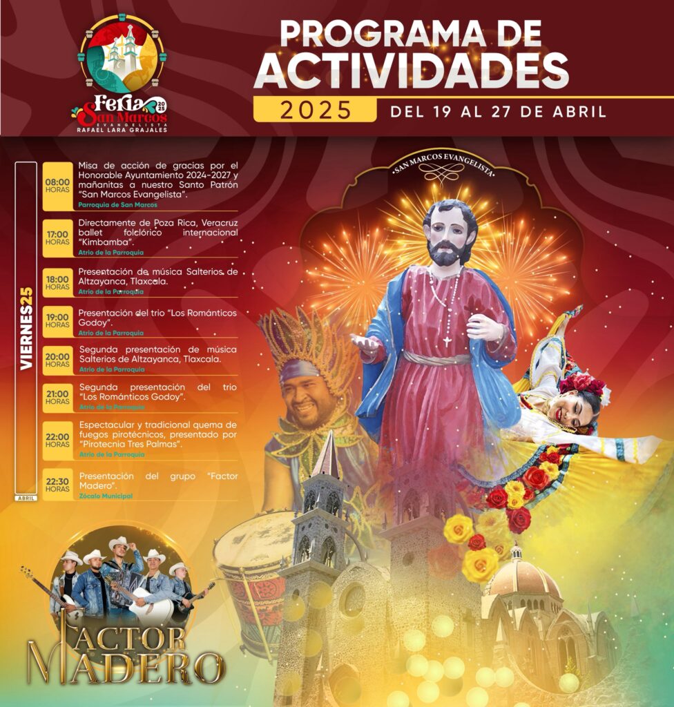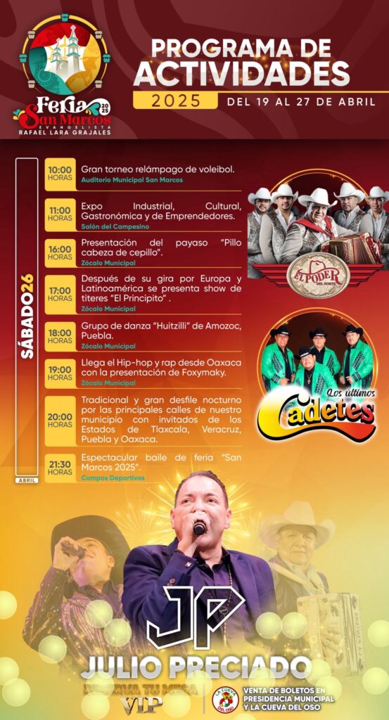 Del 19 al 27 de abril, el H. Ayuntamiento de Rafael Lara Grajales, encabezado por el presidente municipal Horacio Castillo López, invita a toda la población y visitantes a disfrutar de la tradicional Feria San Marcos Evangelista 2025, una de las celebraciones más esperadas del año en la región.