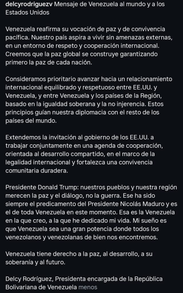 En su primer mensaje como presidenta encargada, durante una sesión del Consejo de Ministros, Delcy Rodríguez invitó a Donald Trump a “trabajar conjuntamente” y llamó a una relación basada en “la paz y el diálogo, no la guerra”.